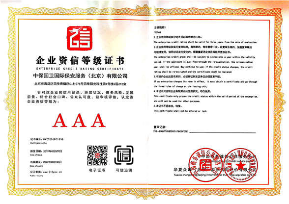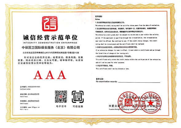 中保國衛(wèi)國際保安服務(wù)(北京)有限公司,屬中保國衛(wèi)集團(tuán)旗下子公司。能全方位的為大型客戶提供優(yōu)質(zhì)的安保、押運(yùn)服務(wù),是集人防和技防于一體的新型正規(guī)化綜合安保押運(yùn)服務(wù)企業(yè),提供人防、物防、技防、聯(lián)網(wǎng)報*、非武裝押運(yùn)等安防相關(guān)的一站式服務(wù)。 公司在國內(nèi)多省設(shè)立有分公司及分支機(jī)構(gòu),著重提升安全押運(yùn)、智能技術(shù)押運(yùn)及安全技術(shù)防范相關(guān)的服務(wù),業(yè)務(wù)范圍覆蓋全國一、二線城市、港澳地區(qū)以及海外地區(qū)。安保方面主要為政府機(jī)構(gòu)、金融機(jī)構(gòu)、企事業(yè)單位、醫(yī)療衛(wèi)生、高等院校、工業(yè)園區(qū)、大型商場、高檔住宅、智能商務(wù)樓、大型活動提供門衛(wèi)、守護(hù)、巡邏、押運(yùn)(非武裝)、安全檢查、保安特勤、私人護(hù)衛(wèi)、消防中控、安全技術(shù)防范、遠(yuǎn)洋護(hù)航等全方位服務(wù),同時面向國際市場,為中資企業(yè)在“一帶一路”沿線國家投資提供境外安保服務(wù)。 >> 更多內(nèi)容 |